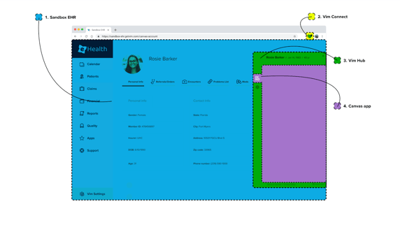 Vim-owned simulation (mock EHR) of a generic EHR environment replicating real EHR workflows. Vim’s sandbox EHR allows you to test your customer-facing application prior to submitting it for review as well as after when working on new features to add to your application. You can replicate real life EHR scenarios and experience as a real EHR user to: